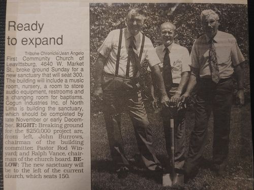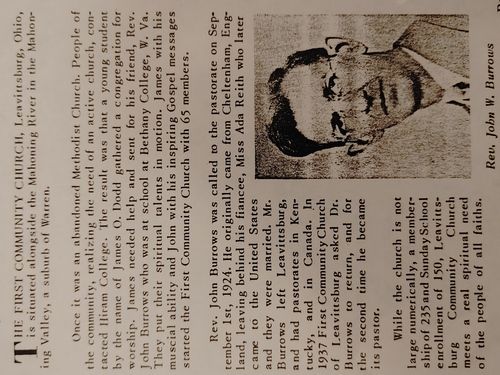 In the beginning decades of the church, there were a few different ministers such as Rev J.R. Dodd, Rev C. C. Gramlich, Rev. Gregory and Rev. Bunch. However the longest minister was Rev. John Burrows. He originally started with Leavittsburg First Community in 1924. He left in 1927 for approximately a decade to serve in Kentucky and Canada. He returned in 1937 to serve until the Lord called him home in 1955.
